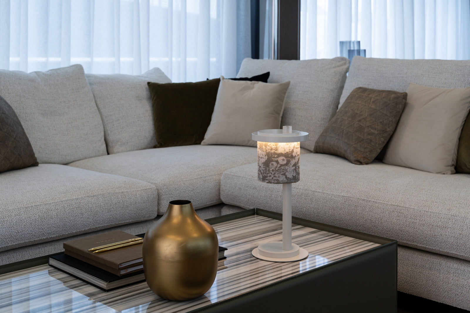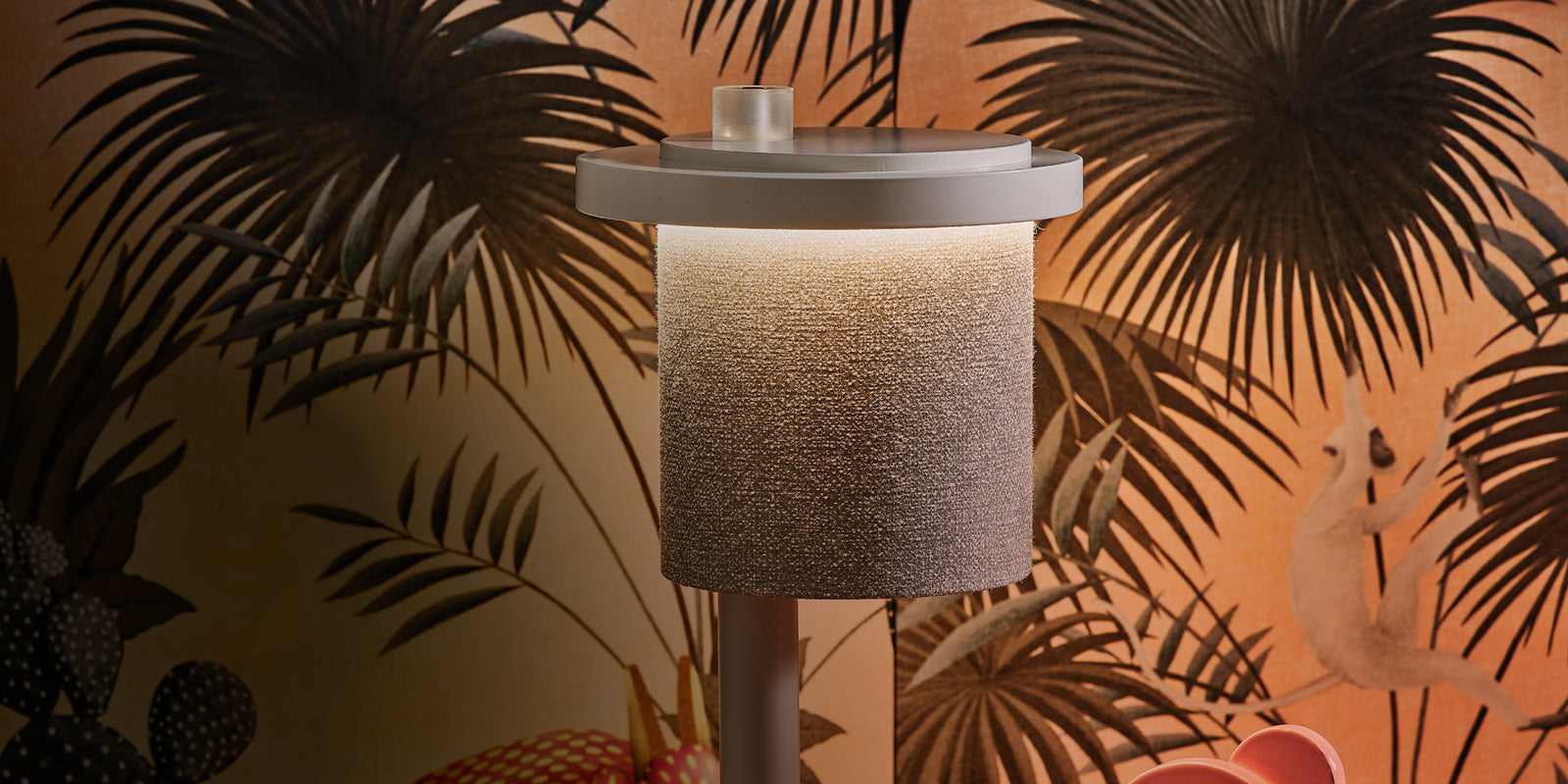 The light diffuser, lined with a Rubelli textile, sparks soft and warm light through textures that resemble ancient stones and sunburnt paint.